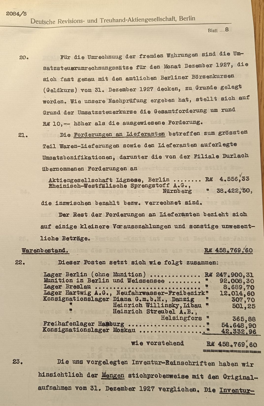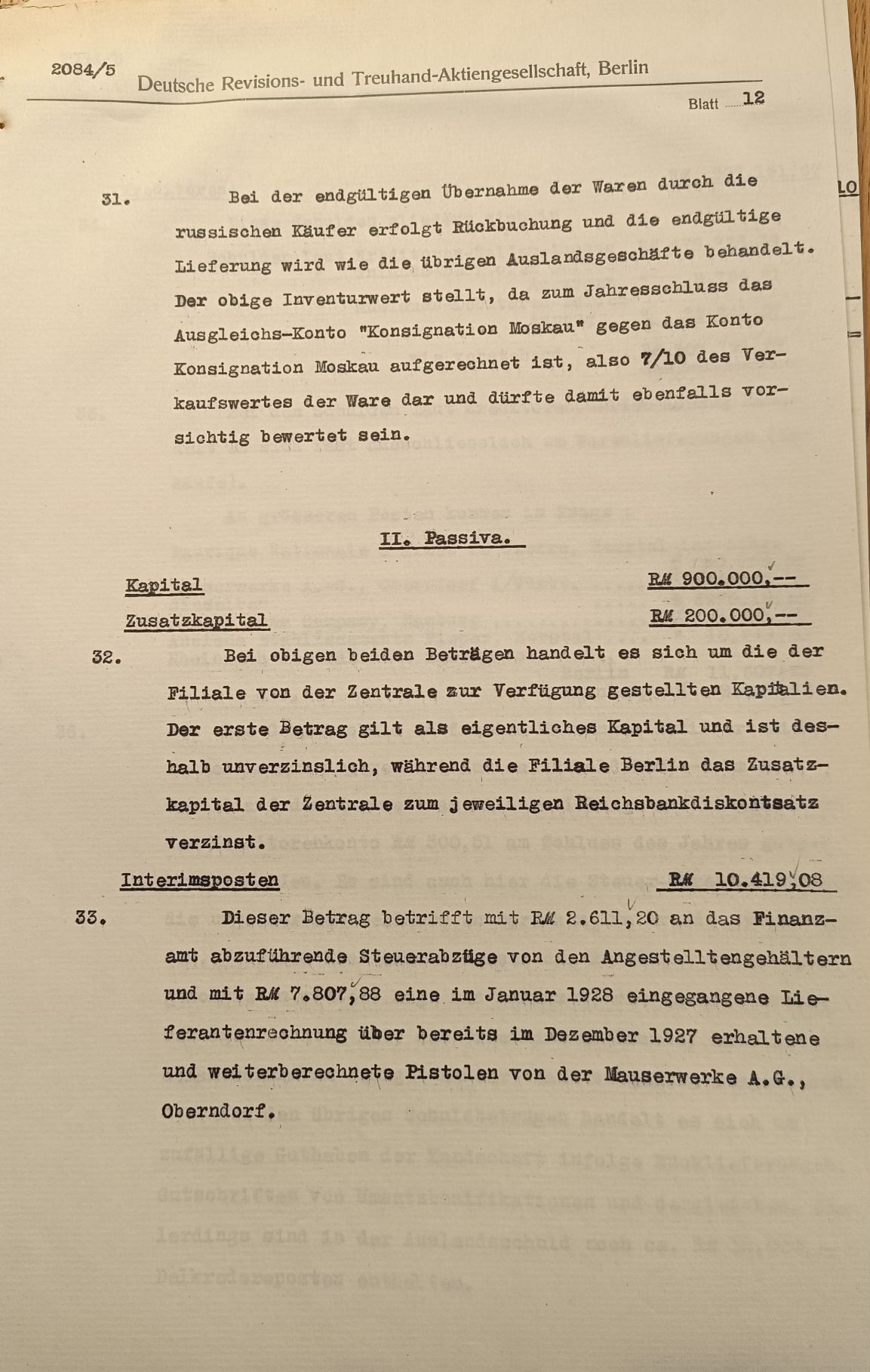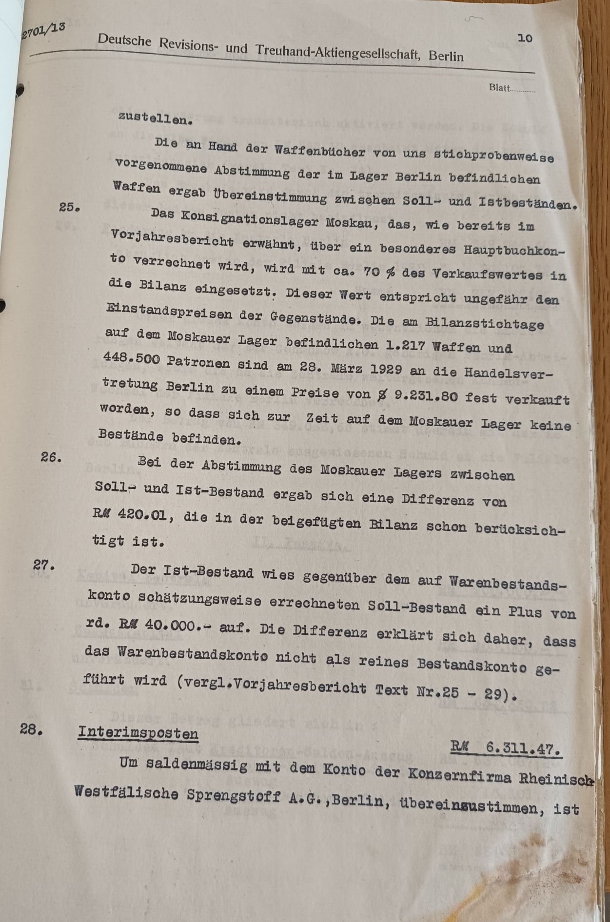 25. Консигнационный склад в Москве, который, как уже упоминалось в отчете за прошлый год, проводится через особый счет в главной книге, внесен в баланс в размере ок. 70 % от продажной стоимости. Эта стоимость примерно соответствует ценам закупки товаров. Находившиеся на московском складе на отчетную дату баланса 1.217 единиц оружия и 448.500 патронов были окончательно проданы 28 марта 1929 года Торговому представительству в Берлине по цене $ 9.231,80, так что в настоящее время на московском складе запасов не имеется.