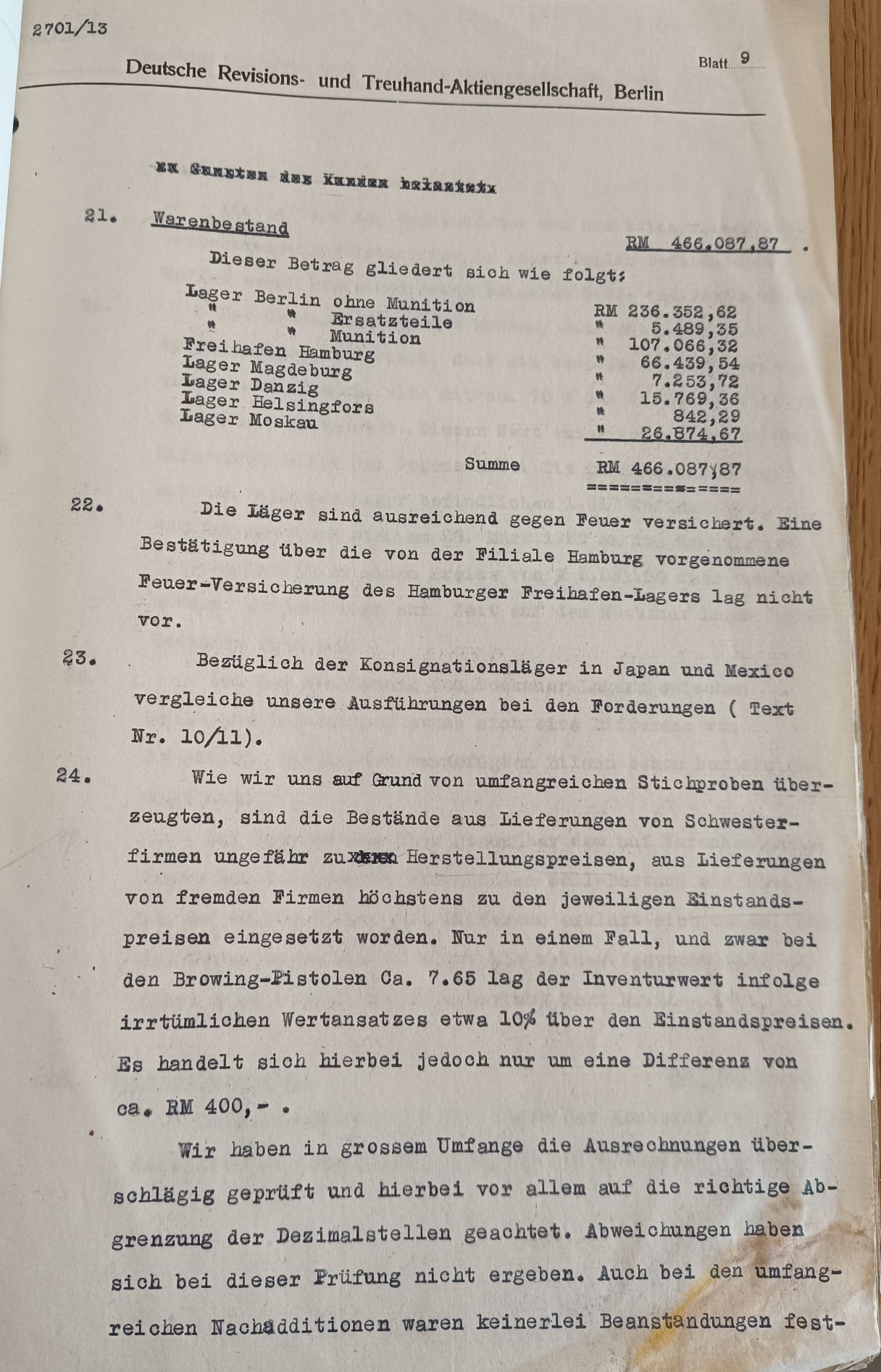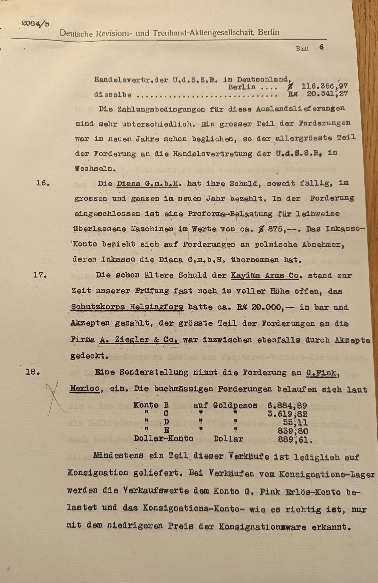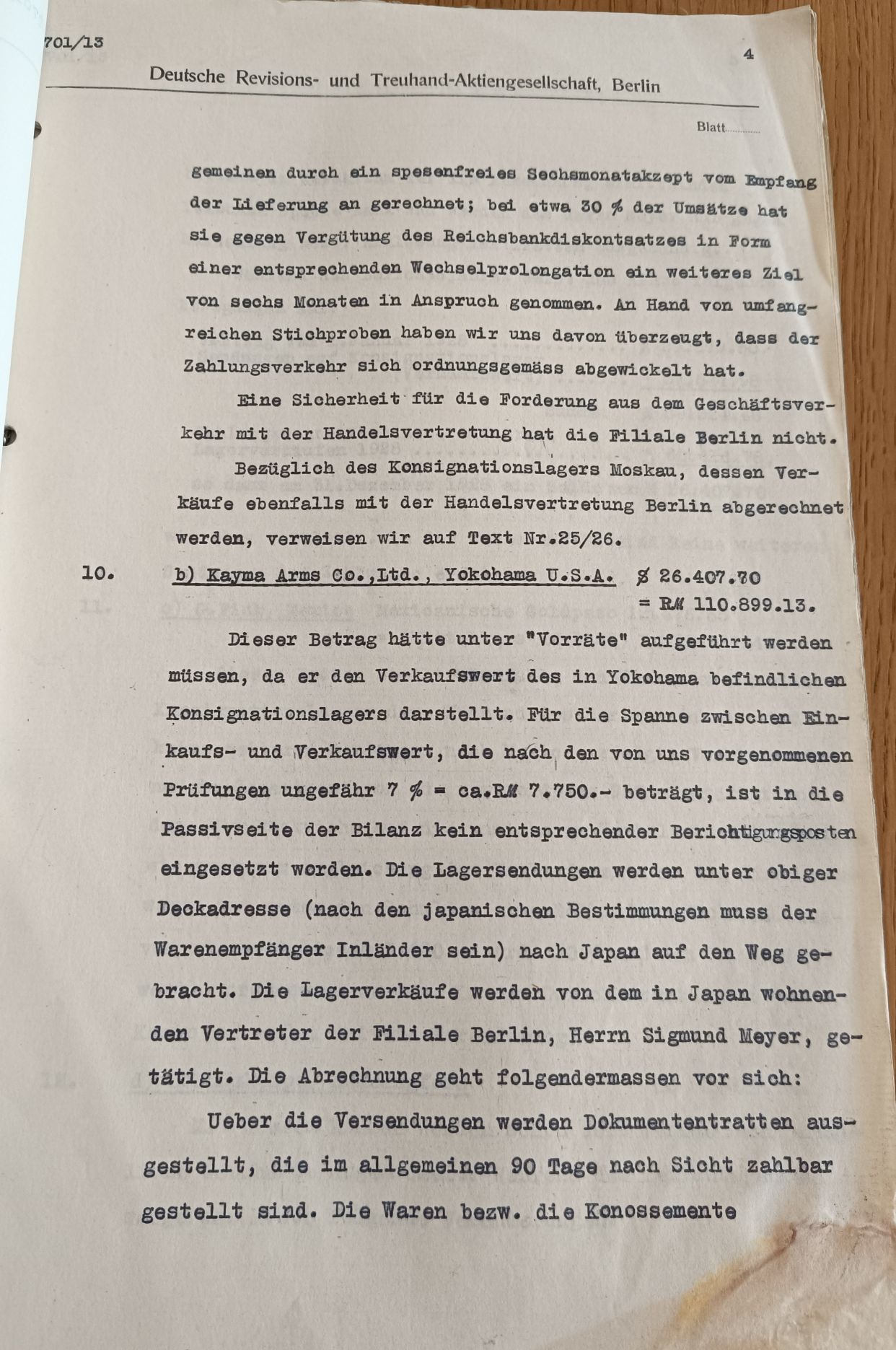 25. Консигнационный склад в Москве, который, как уже упоминалось в отчете за прошлый год, проводится через особый счет в главной книге, внесен в баланс в размере ок. 70 % от продажной стоимости. Эта стоимость примерно соответствует ценам закупки товаров. Находившиеся на московском складе на отчетную дату баланса 1.217 единиц оружия и 448.500 патронов были окончательно проданы 28 марта 1929 года Торговому представительству в Берлине по цене $ 9.231,80, так что в настоящее время на московском складе запасов не имеется.