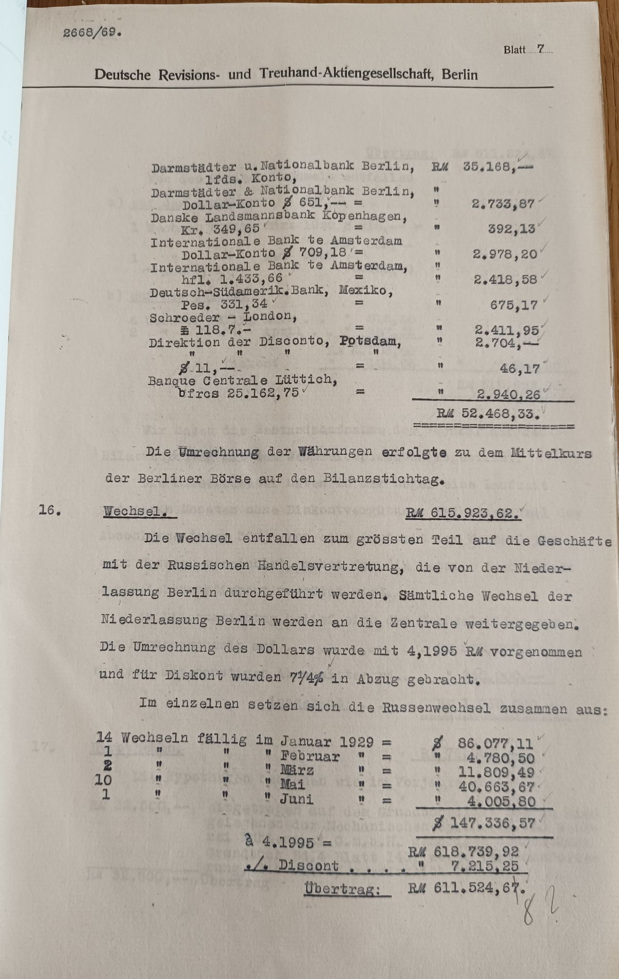Векселя по большей части относятся к сделкам с Русским торговым представительством, которые проводятся Берлинским отделением. Все векселя Берлинского отделения передаются в центральный офис. Пересчет доллара производился по курсу 4,1995 РМ, а за дисконт было вычтено 7 1/4 %.