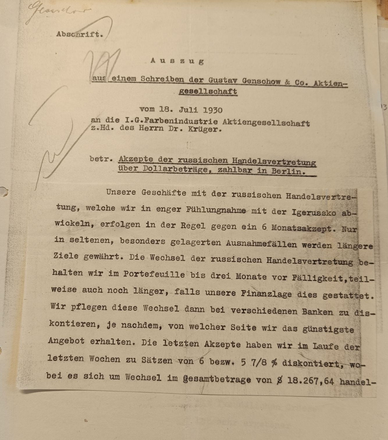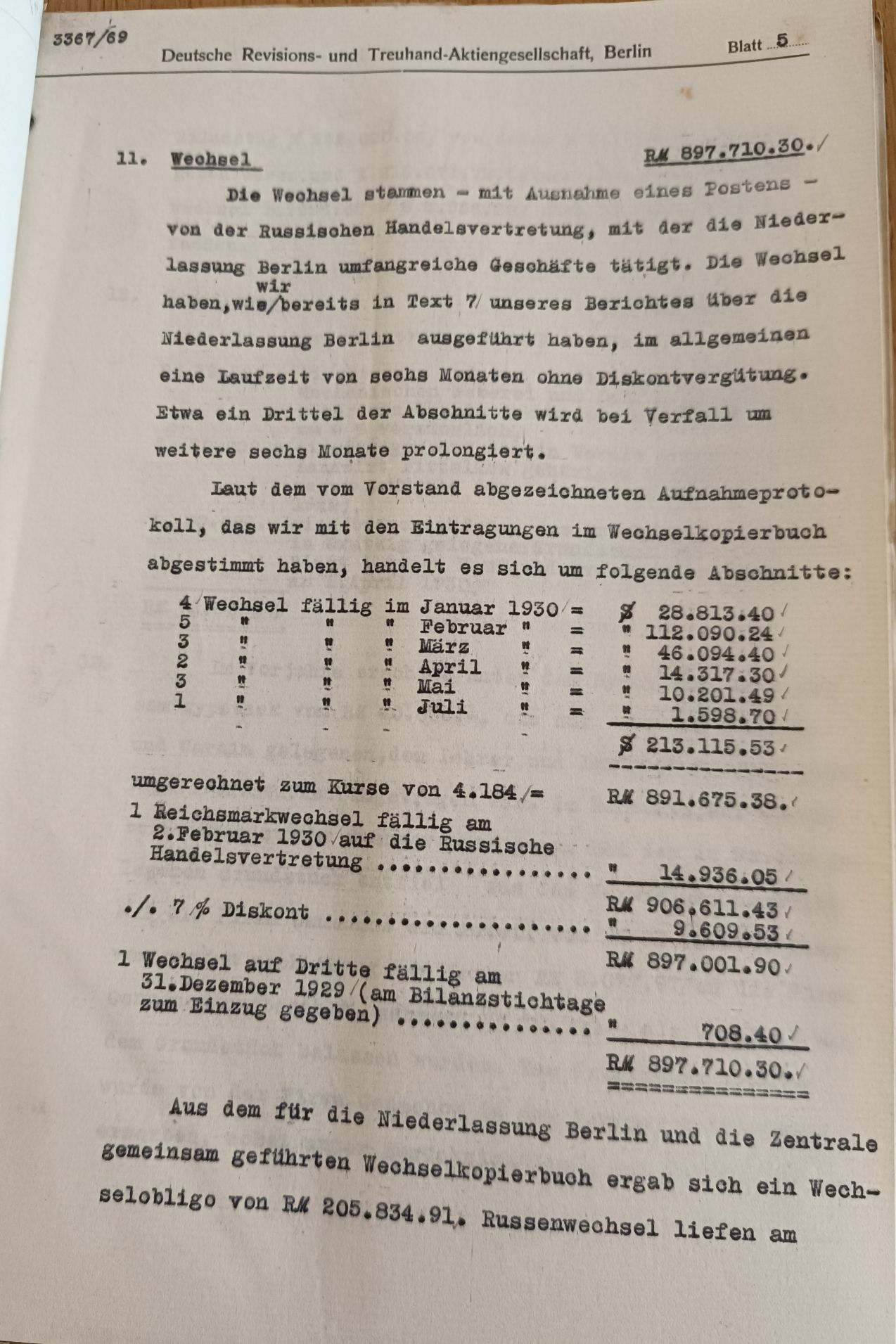 Деловой оборот с Русским торговым представительством осуществляется точно так же, как и в прошлом году (см. прошлогодний отчет, текст № 9). В целом, Русское торговое представительство платит беспроцентным шестимесячным акцептом. Примерно одна треть векселей при наступлении срока оплаты была пролонгирована еще на 6 месяцев при условии компенсации в размере процентной ставки Рейхсбанка.