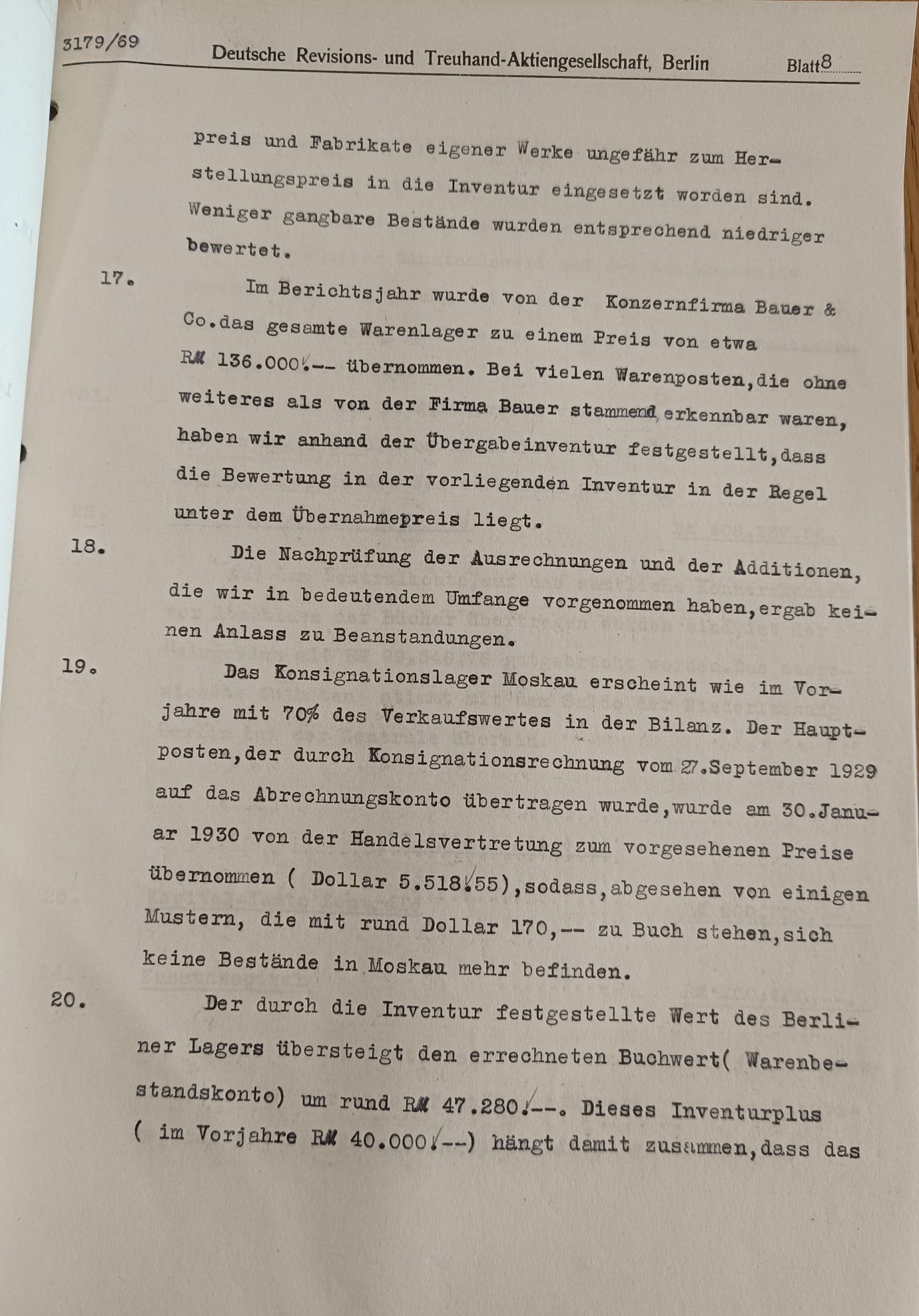 19. Консигнационный склад в Москве отражен в балансе, как и в прошлом году, в размере 70 % от продажной стоимости. Основная часть, которая была перенесена на расчетный счет согласно консигнационному счету от 27 сентября 1929 года, была принята Торговым представительством 30 января 1930 года по предусмотренной цене (5.518,55 долларов), так что, за исключением нескольких образцов, которые числятся в книгах по цене около 170,– долларов, запасов в Москве больше не имеется.