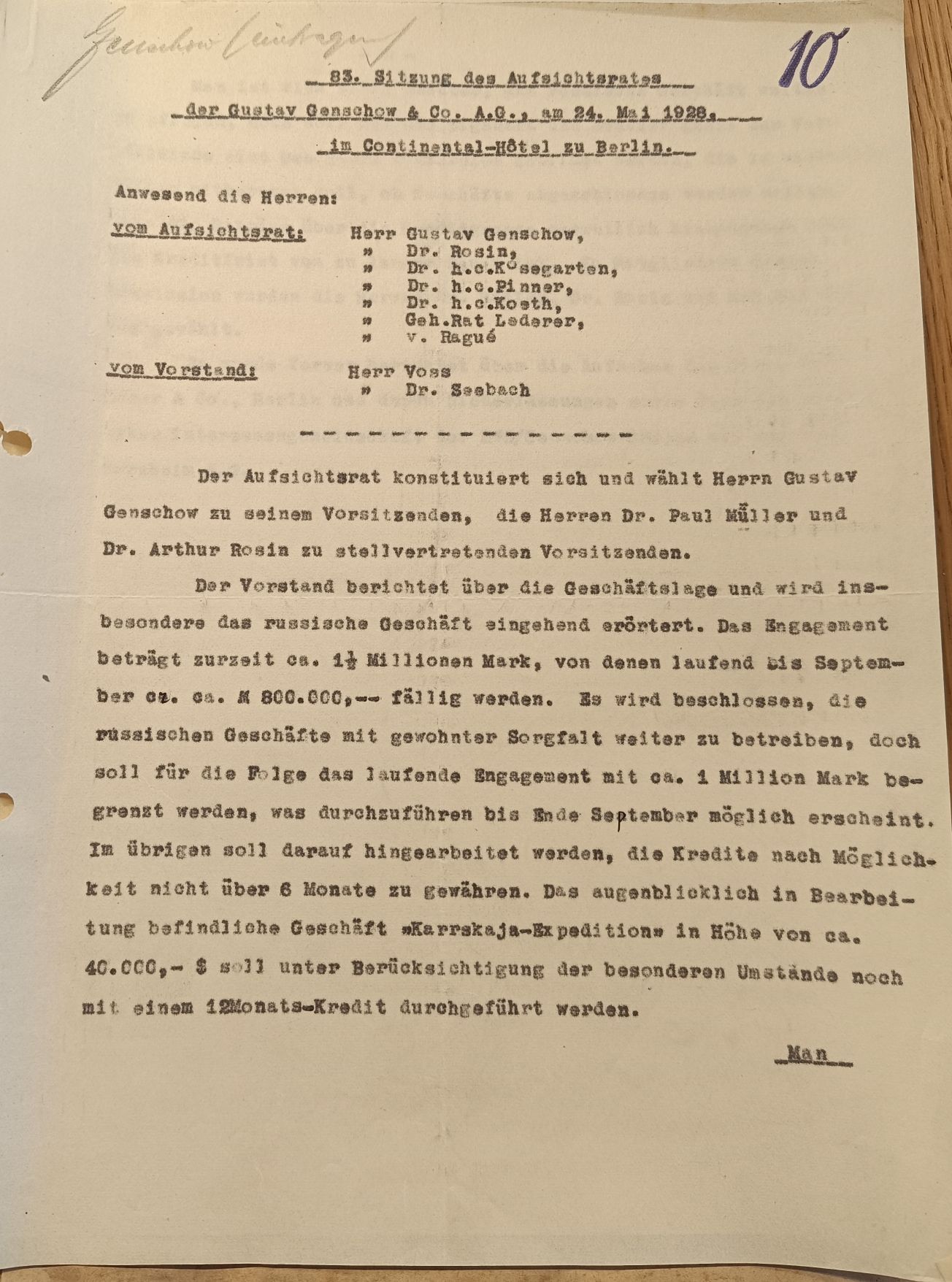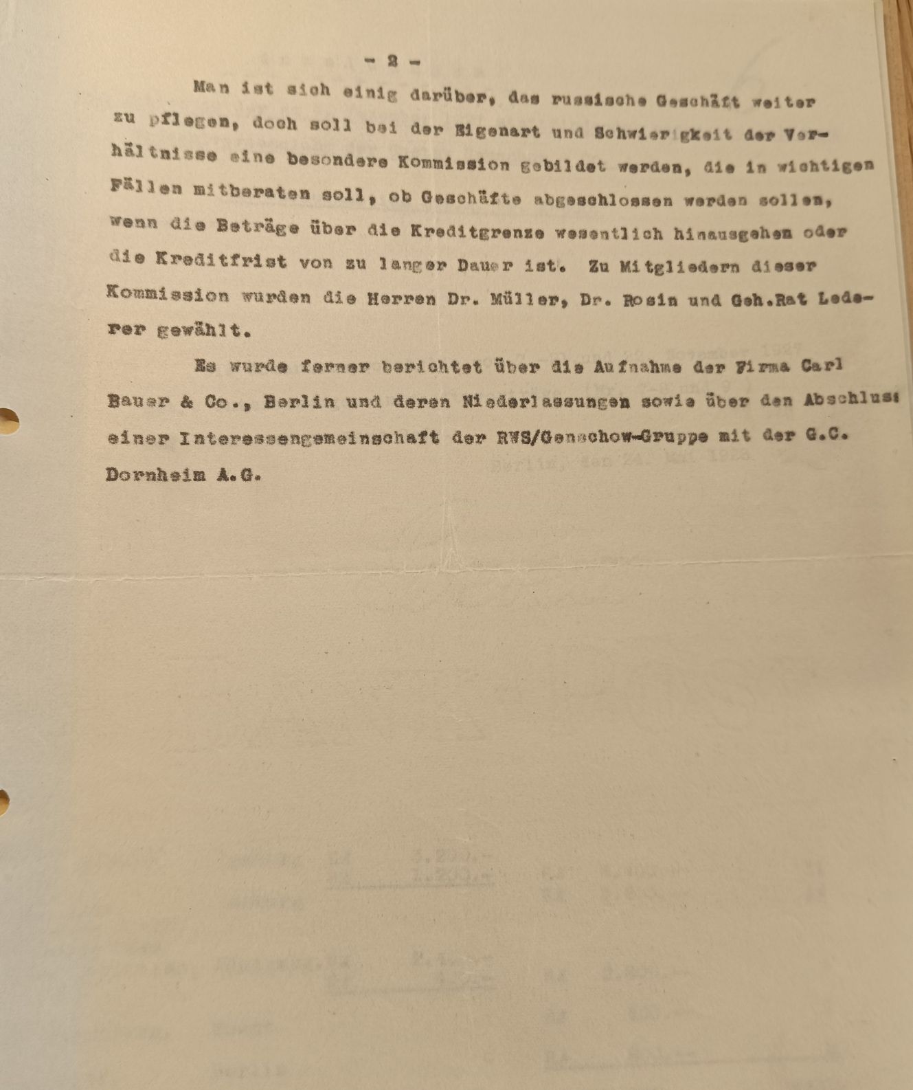 Достигнуто согласие в том, чтобы продолжать поддерживать дела с Россией, однако ввиду специфики и сложности условий должна быть сформирована особая комиссия, которая в важных случаях будет совместно принимать решение о том, следует ли заключать сделки, если суммы существенно превышают кредитный лимит или срок кредита слишком продолжителен. Членами этой комиссии были избраны господа доктор Мюллер, доктор Розин и тайный советник Ледерер.