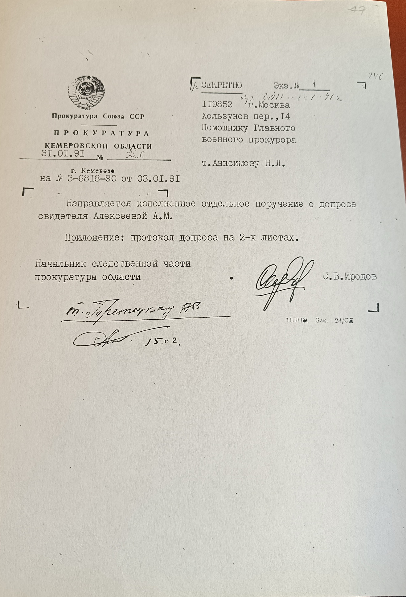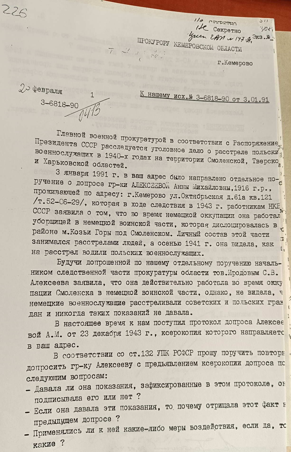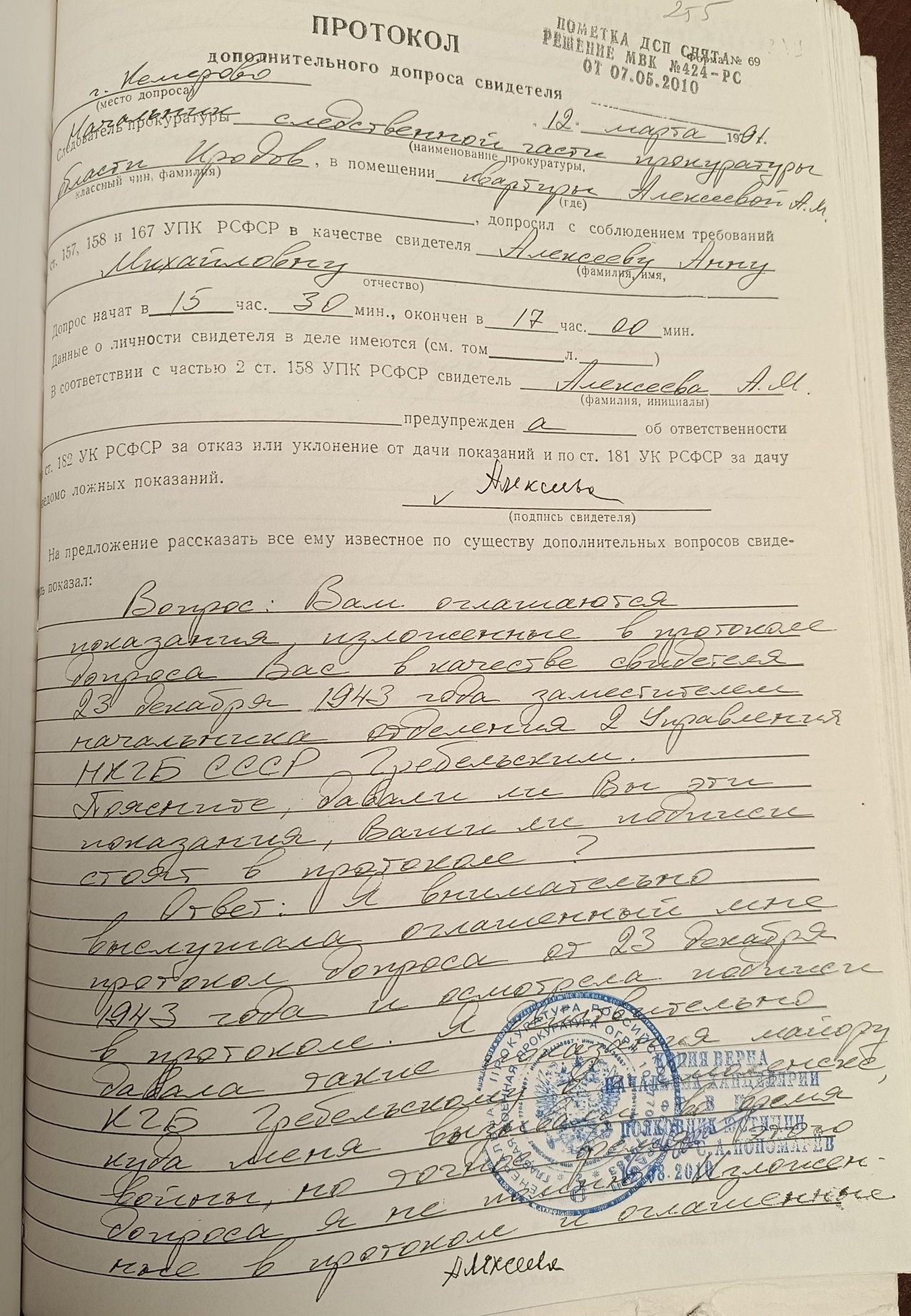 После первого допроса в ГВП поступил официальный текст допроса Алексеевой в 1943 г., который, очевидно, противоречил ее допросу 1991 г., поэтому был необходим передопрос. Вопросы для нового допроса перечислены в поручении В. Кондратова, при этом обязательно было предъявление свидетельнице ксерокопии ее старого допроса (там же, лл. 307-308):