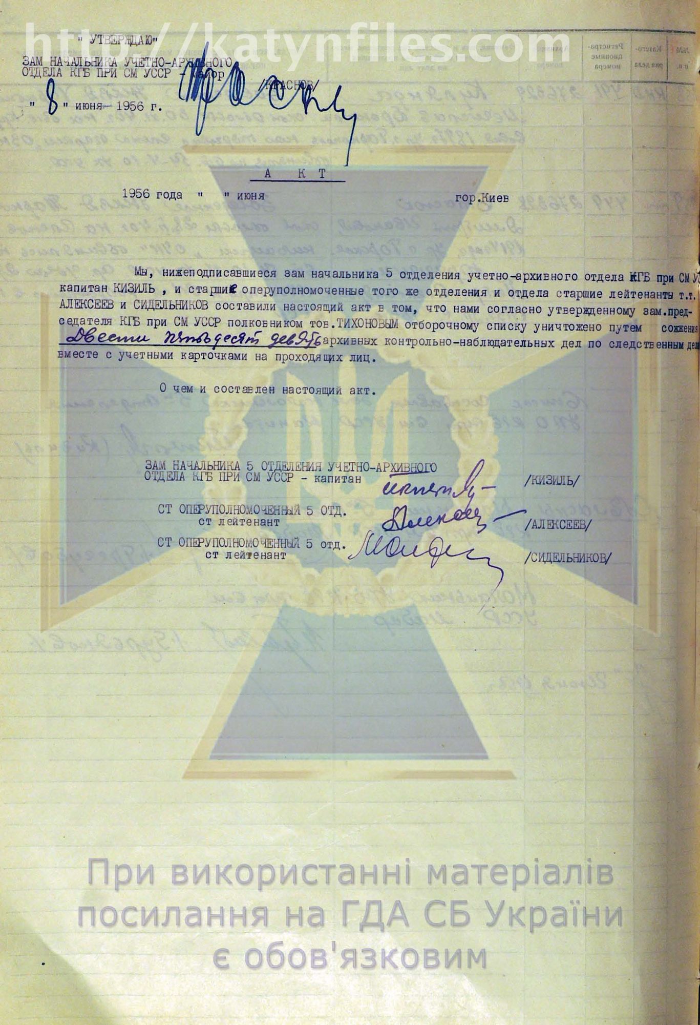 Особенно значим второй документ. В нем чиновники учетно-архивного отдела (далее - УАО) КГБ при СМ УССР предлагают уничтожить 2500 учетных карточек, изъятых из оперативно-справочной картотеки бывшего отдела "А" МГБ УССР и УМГБ западных областей Украины. В заключении написано, что карточки были изъяты в 1952 году по устному указанию руководства МГБ СССР. Карточки эти были заведены на арестованных НКВД бывших офицеров польской армии, полицейских, жандармов, агентов и т. п. В заключении отмечается, что в 1940 году данные арестованные "вместе со следственными делами и вторыми экземплярами учетных карточек были направлены в НКВД СССР", и дальше следует уже упомянутая зачеркнутая фраза - "где и осуждены в особом порядке". В заключении предлагается уничтожить карточки путем сожжения за ненадобностью "на основании устного указания начальника УАО МГБ при СМ СССР полковника тов. Плетнева". Что и было сделано (акт от 8 июня, л. 12).