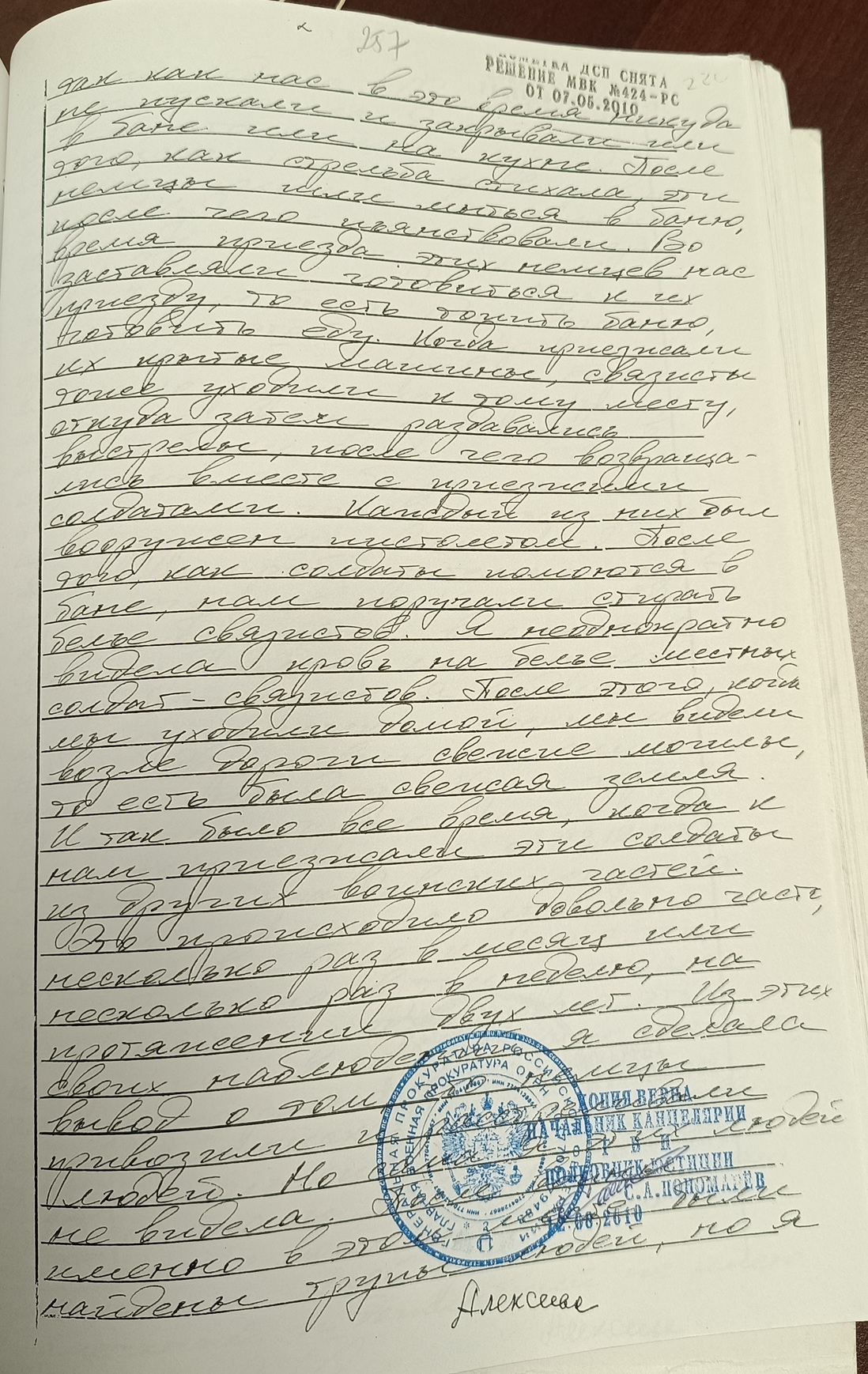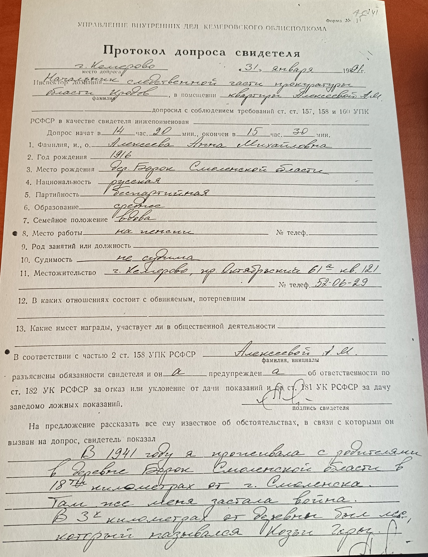 Если Алексеева не признает факт дачи ею показаний в 1943 году, то прошу отобрать у нее образцы почерка для проведения почерковедческой экспертизы, оформив это надлежащим образом.