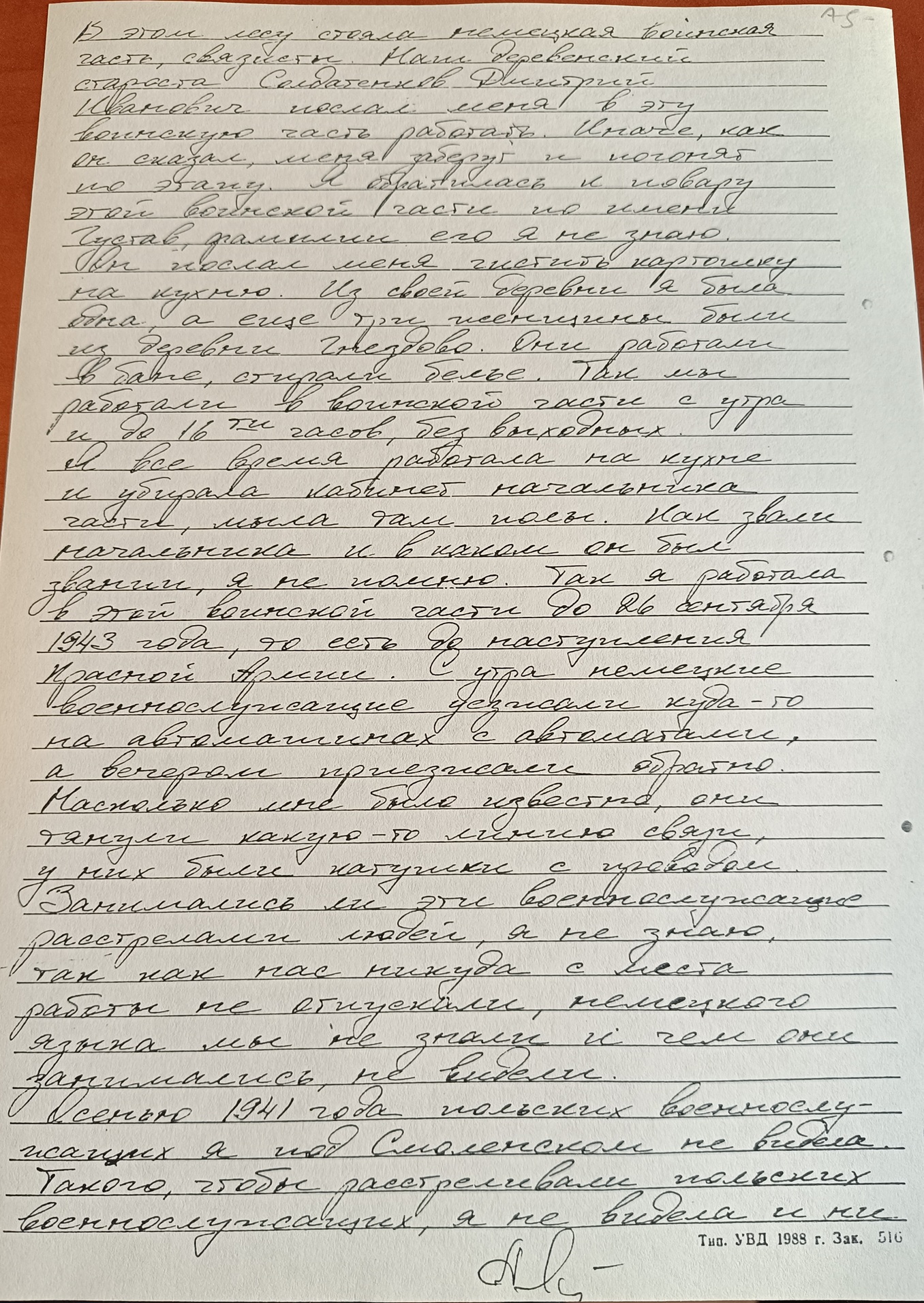 В этом лесу стояла немецкая воинская часть, связисты. Наш деревенский староста Солдатенков Дмитрий Иванович послал меня в эту воинскую часть работать. Иначе, как он сказал, меня заберут и погонят по этапу. Я обратилась к повару этой воинской части по имени Густав, фамилии его я не знаю. Он послал меня чистить картошку на кухню. Из своей деревни я была одна, а еще три женщины были из деревни Гнездово. Они работали в бане, стирали белье. Так мы работали в воинской части с утра и до 16-ти часов, без выходных. Я все время работала на кухне и убирала кабинет начальника части, мыла там полы. Как звали начальника и в каком он был звании, я не помню. Так я работала в этой воинской части до 26 сентября 1943 года, то есть до наступления Красной Армии. С утра немецкие военнослужащие уезжали куда-то на автомашинах с автоматами, а вечером приезжали обратно. Насколько мне было известно, они тянули какую-то линию связи, у них были катушки с проводом. Занимались ли эти военнослужащие расстрелами людей я не знаю, так как нас никуда с места работы не отпускали, немецкого языка мы не знали и чем они занимались, не видели. Осенью 1941 года польских военнослужащих я под Смоленском не видела. Такого, чтобы расстреливали польских военнослужащих, я не видела и ни от кого этого не слышала.
