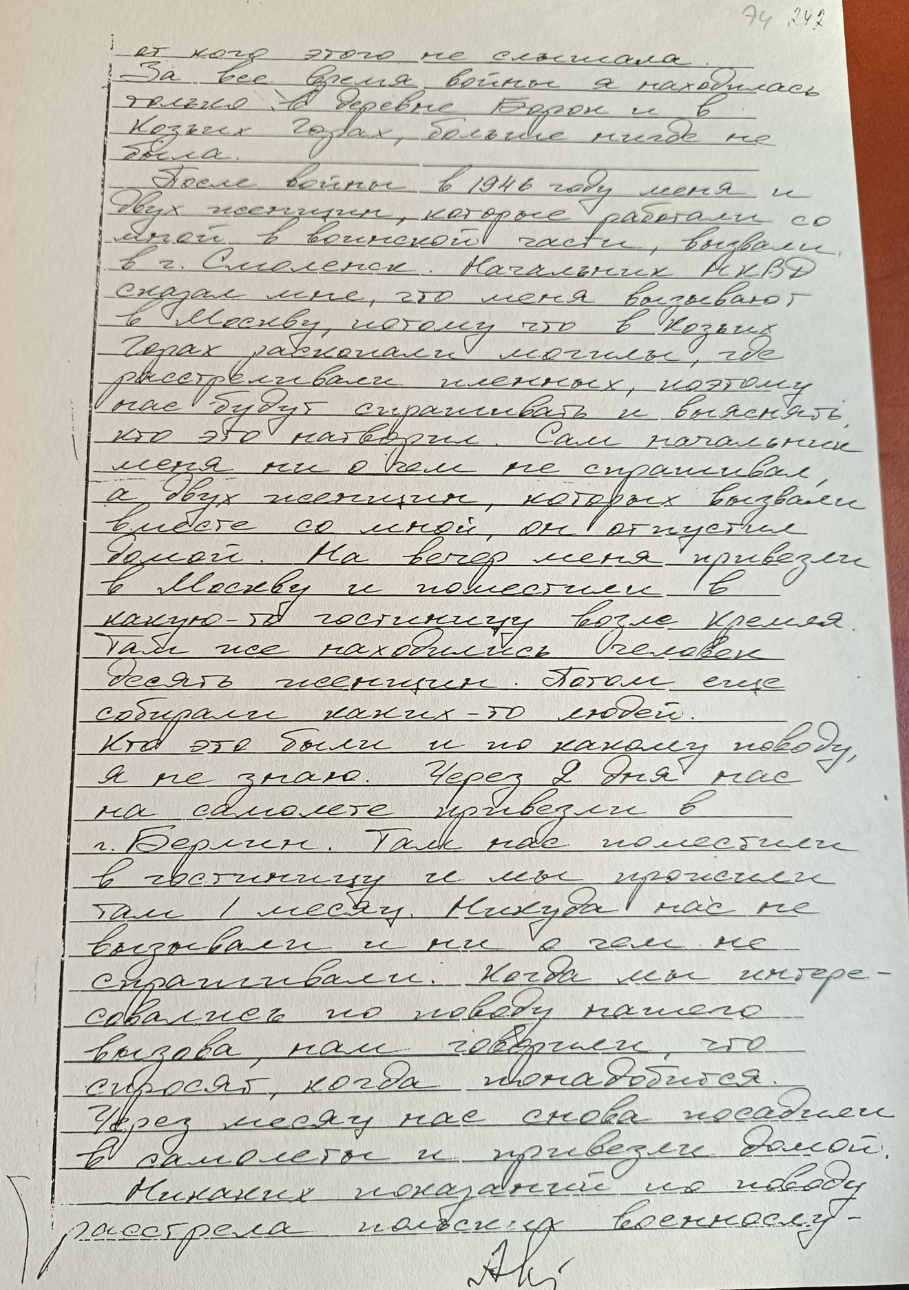 После войны в 1946 году меня и двух женщин которые работали со мной в воинской части, вызвали в г. Смоленск. Начальник НКВД сказал мне, что меня вызывают в Москву, потому что в Козьих Горах раскопали могилы, где расстреливали пленных, поэтому нас будут спрашивать и выяснять, кто это натворил. Сам начальник меня ни о чем не спрашивал, а двух женщин которых вызвали вместе со мной, он отпустил домой. На вечер меня привезли в Москву и поместили в какую-то гостиницу возле Кремля. Там же находились человек десять женщин. Потом еще собирали каких-то людей. Кто это были и по какому поводу, я не знаю. Через 2 дня нас на самолете привезли в г. Берлин. Там нас поместили в гостиницу и мы прожили там 1 месяц. Никуда нас не вызывали и ни о чем не спрашивали. Когда мы интересовались по поводу нашего вызова, нам говорили, что спросят, когда понадобится. Через месяц нас снова посадили в самолеты и привезли домой. Никаких показаний по поводу расстрела польских военнослужащих я никому не давала, никаких протоколов никогда не подписывала. Ни в 1943-1944 годах, ни в другое время работники НКВД со мной на эту тему не беседовали, не допрашивали меня и протоколов не составляли. За то, что я работала у немцев, меня никто после войны не репрессировал и не угрожали мне.