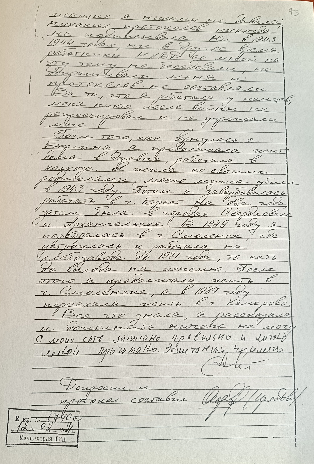 После того, как вернулась с Берлина я продолжала жить дома в деревне, работала в колхозе. Я жила со своими родителями, моего мужа убили в 1943 году. Потом я завербовалась работать г. Брест на два года, затем была в городах Свердловске и Архангельске. В 1949 году я перебралась в г. Смоленск где устроилась и работала на хлебозаводе до 1971 года, то есть до выхода на пенсию. После этого я продолжала жить в г. Смоленске, а в 1987 году переехала жить в г. Кемерово. Все, что знала, я рассказала и дополнить ничем не могу.