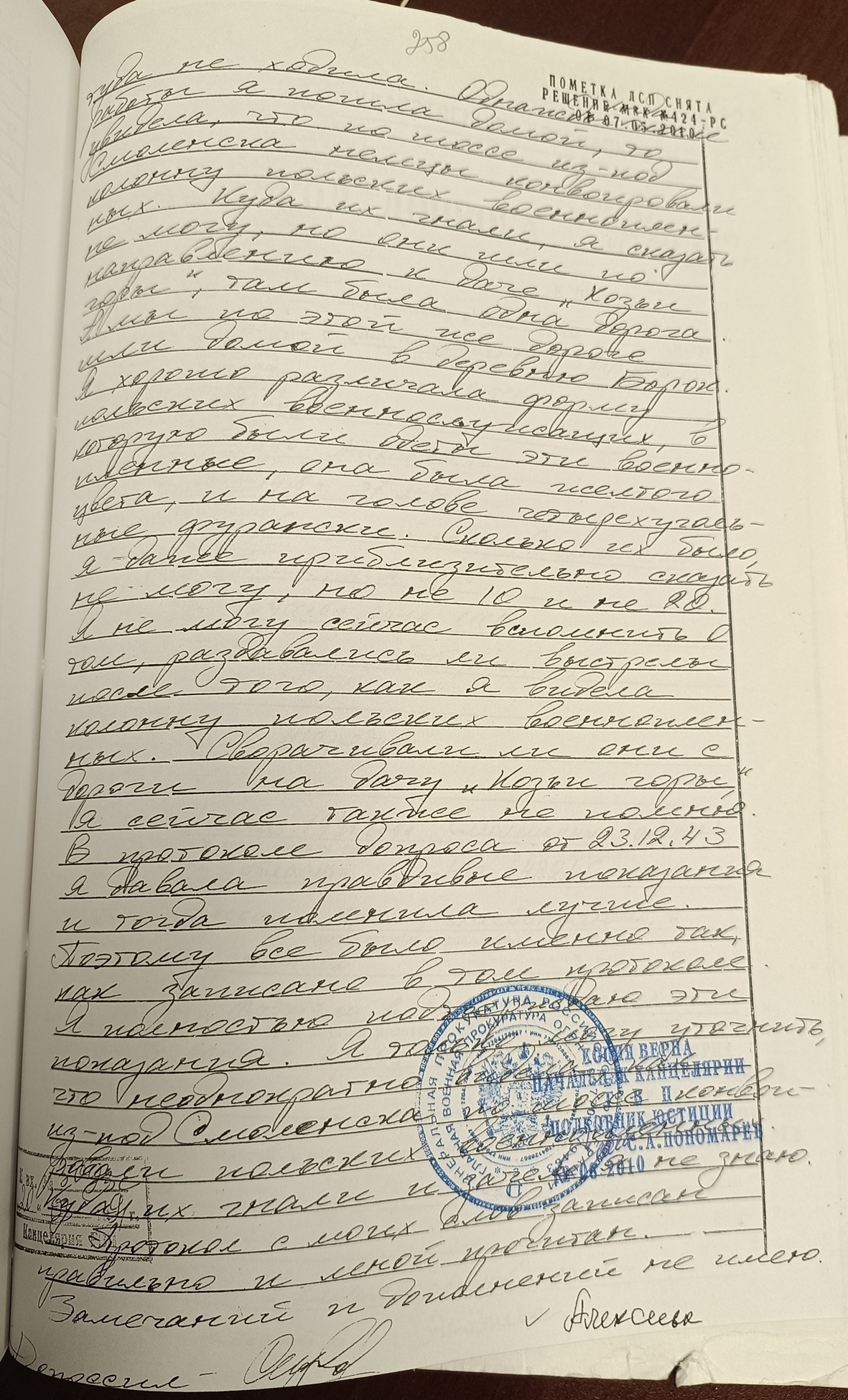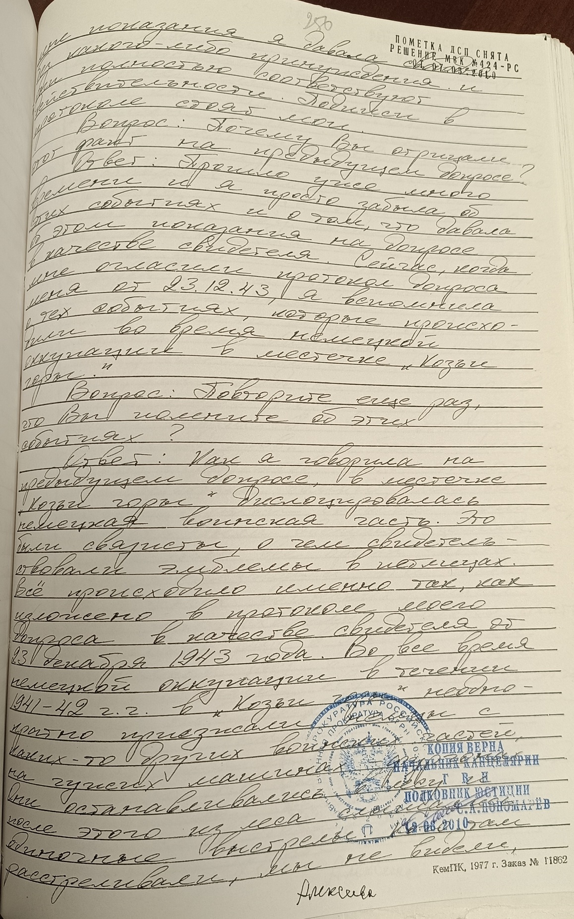 Ответ: Я внимательно выслушала оглашенный мне протокол допроса от 23 декабря 1943 года и осмотрела подписи в протоколе. Я действительно давала такие показания майору КГБ Гребельскому в г. Смоленске, куда меня вызывали во время войны, но точное время этого допроса я не помню. Изложенные в протоколе и оглашенные мне показания я давала свободно, без какого-либо принуждения и они полностью соответствуют действительности. Подписи в протоколе стоят мои.
