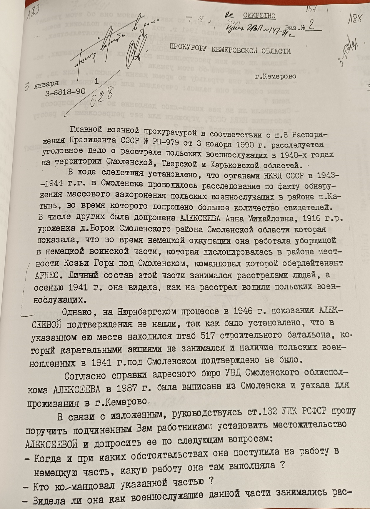В первый раз Алексеевой было предложено задать следующие вопросы (уголовное дело ГВП № 159, т. 13 (нумерация на 1993 г., копия в Катынском музее, Варшава), лл. 257-258):