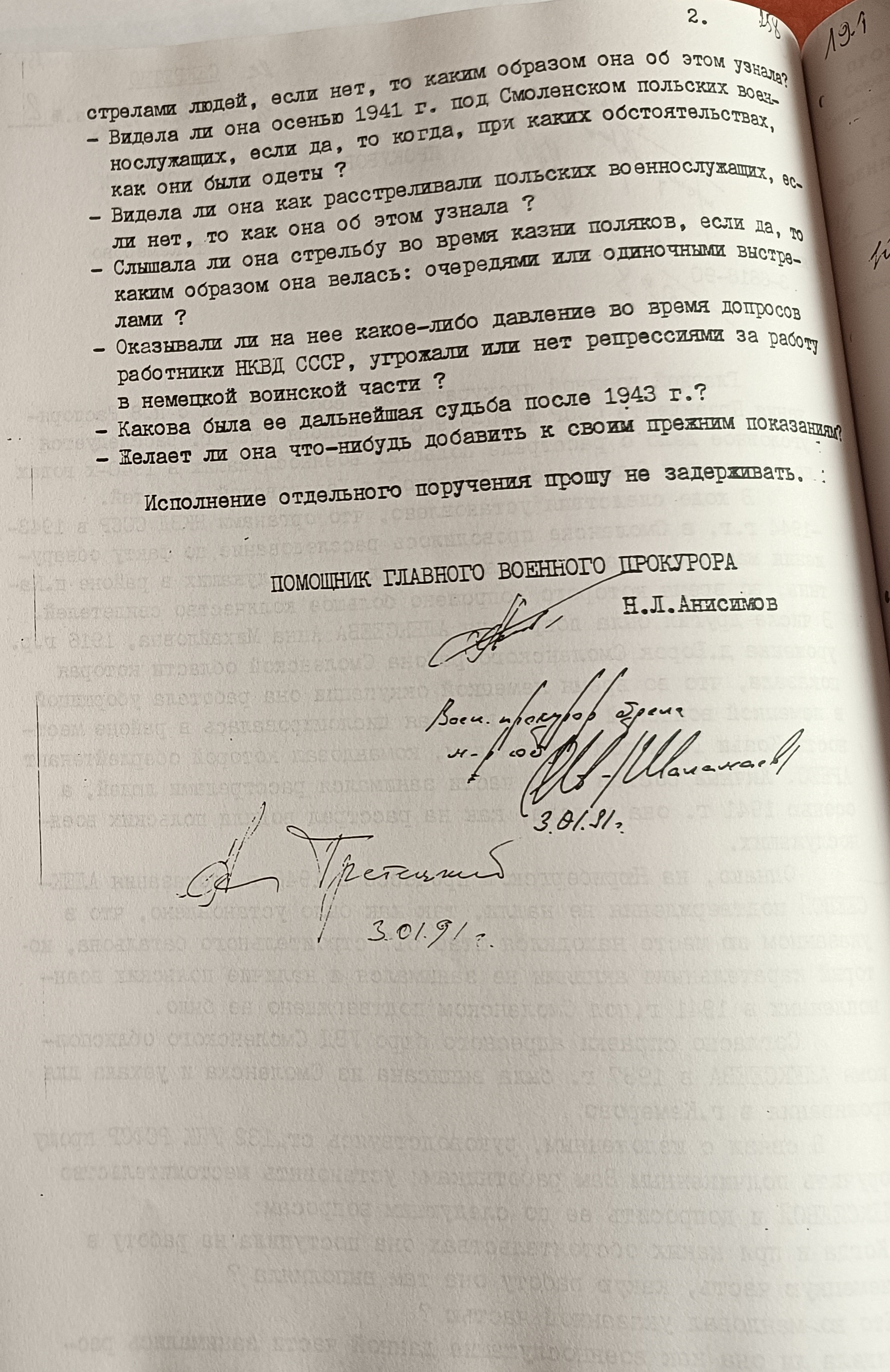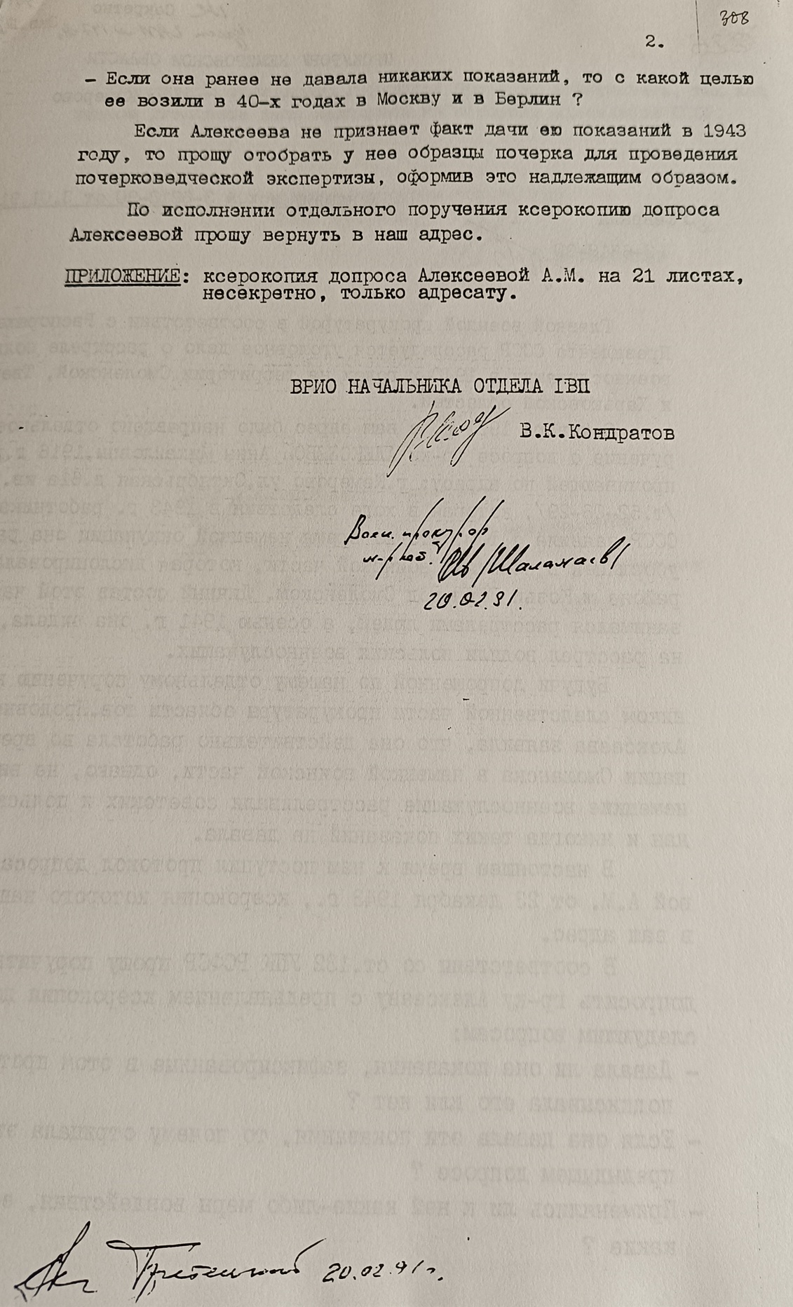 После первого допроса в ГВП поступил официальный текст допроса Алексеевой в 1943 г., который, очевидно, противоречил ее допросу 1991 г., поэтому был необходим передопрос. Вопросы для нового допроса перечислены в поручении В. Кондратова, при этом обязательно было предъявление свидетельнице ксерокопии ее старого допроса (там же, лл. 307-308):