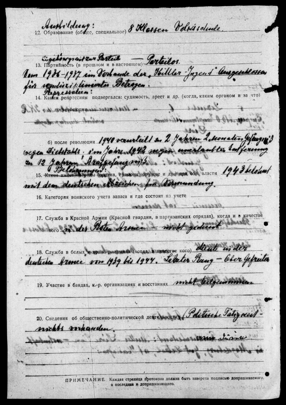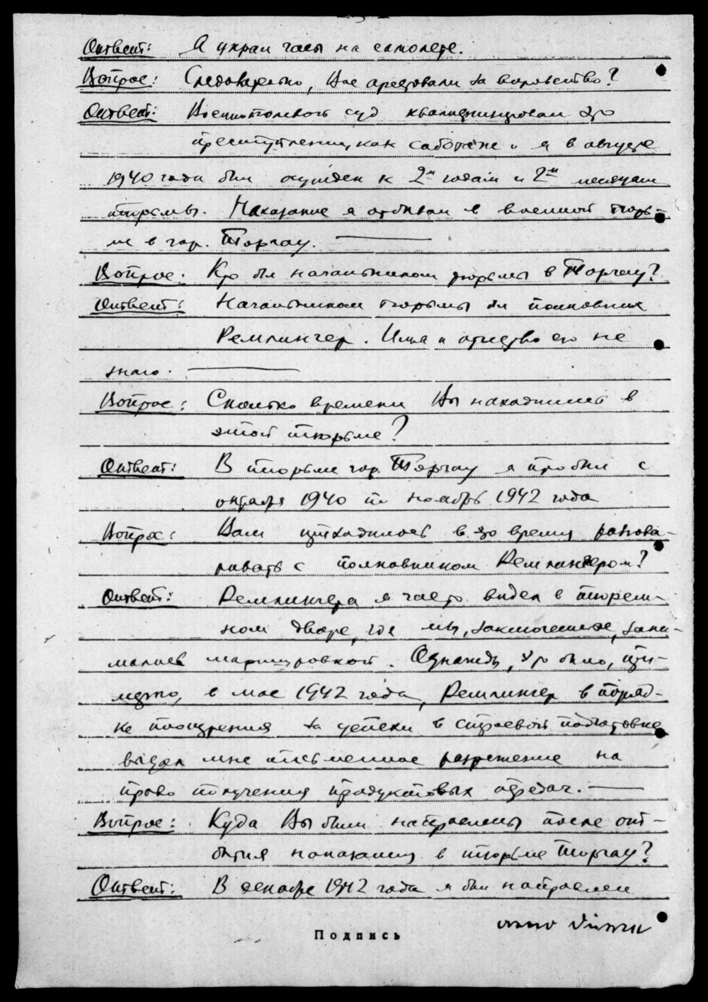 - в августе 1940 г. осужден к 2 г. и 2 месяцам тюрьмы, наказание отбывал в тюрьме в городе Торгау, начальником тюрьмы был полковник Ремлингер;