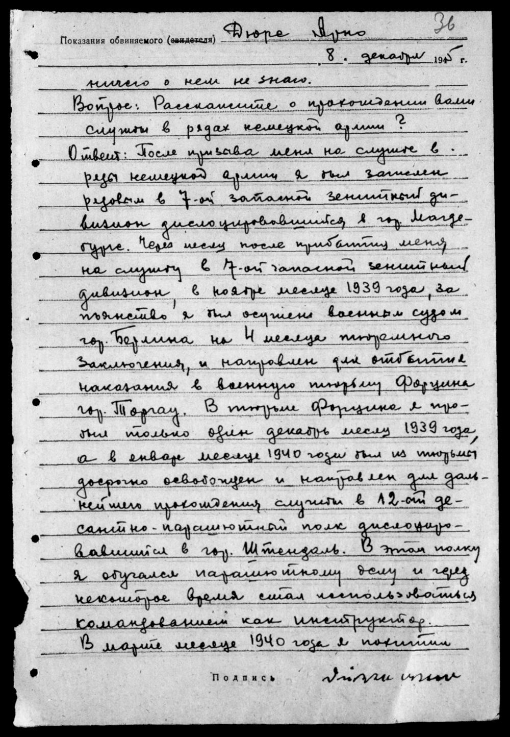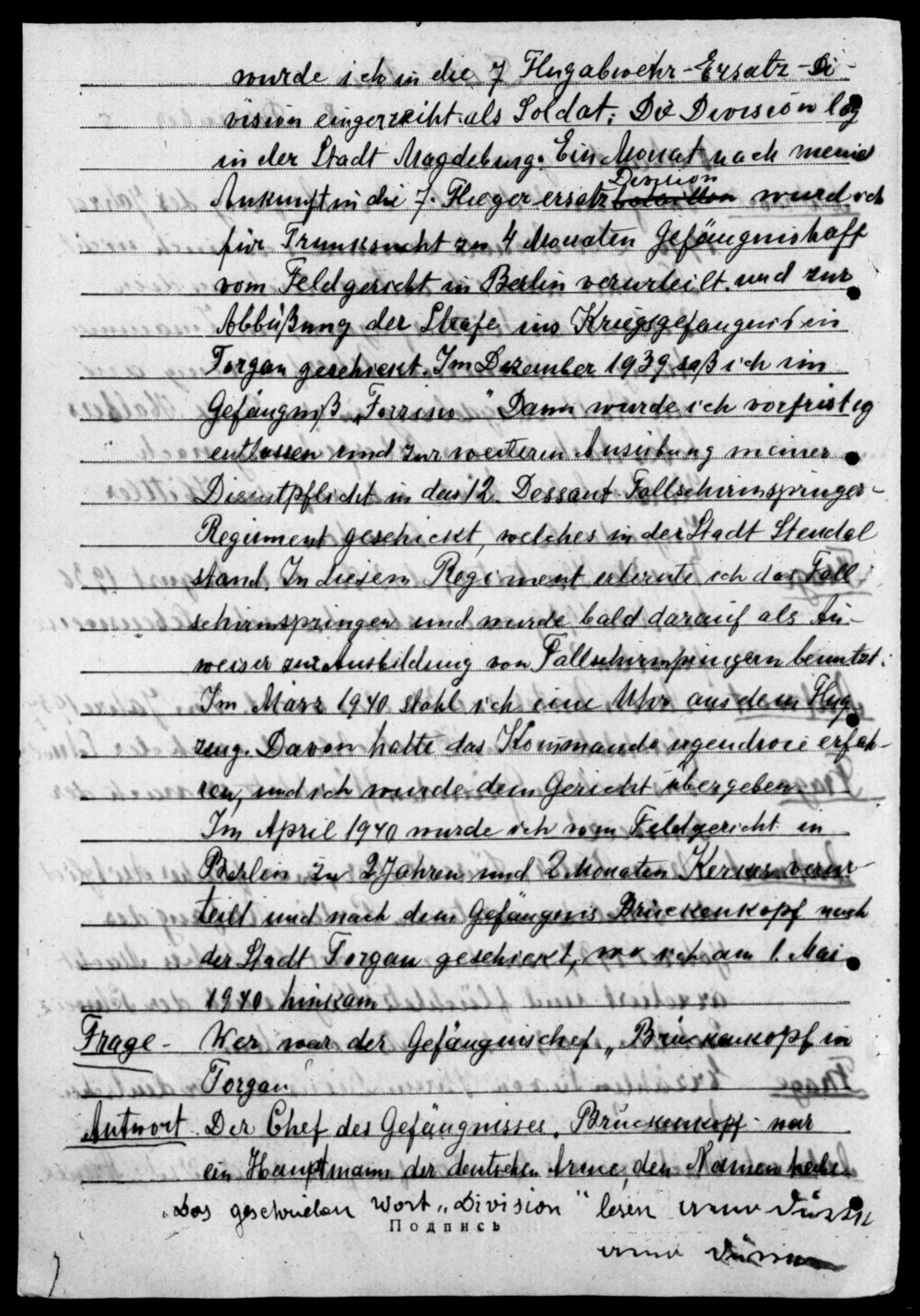 - в апреле 1940 г. осужден к 2 г. и 2 месяцам тюрьмы, наказание отбывал в военной тюрьме "Брюкенкопф" в городе Торгау, куда доставлен 1 мая 1940 г.; комендантом тюрьмы был некий капитан, кроме него тюрьму часто посещал комендант военных тюрем Германии Ремлингер, который относился к заключенным очень жестоко;