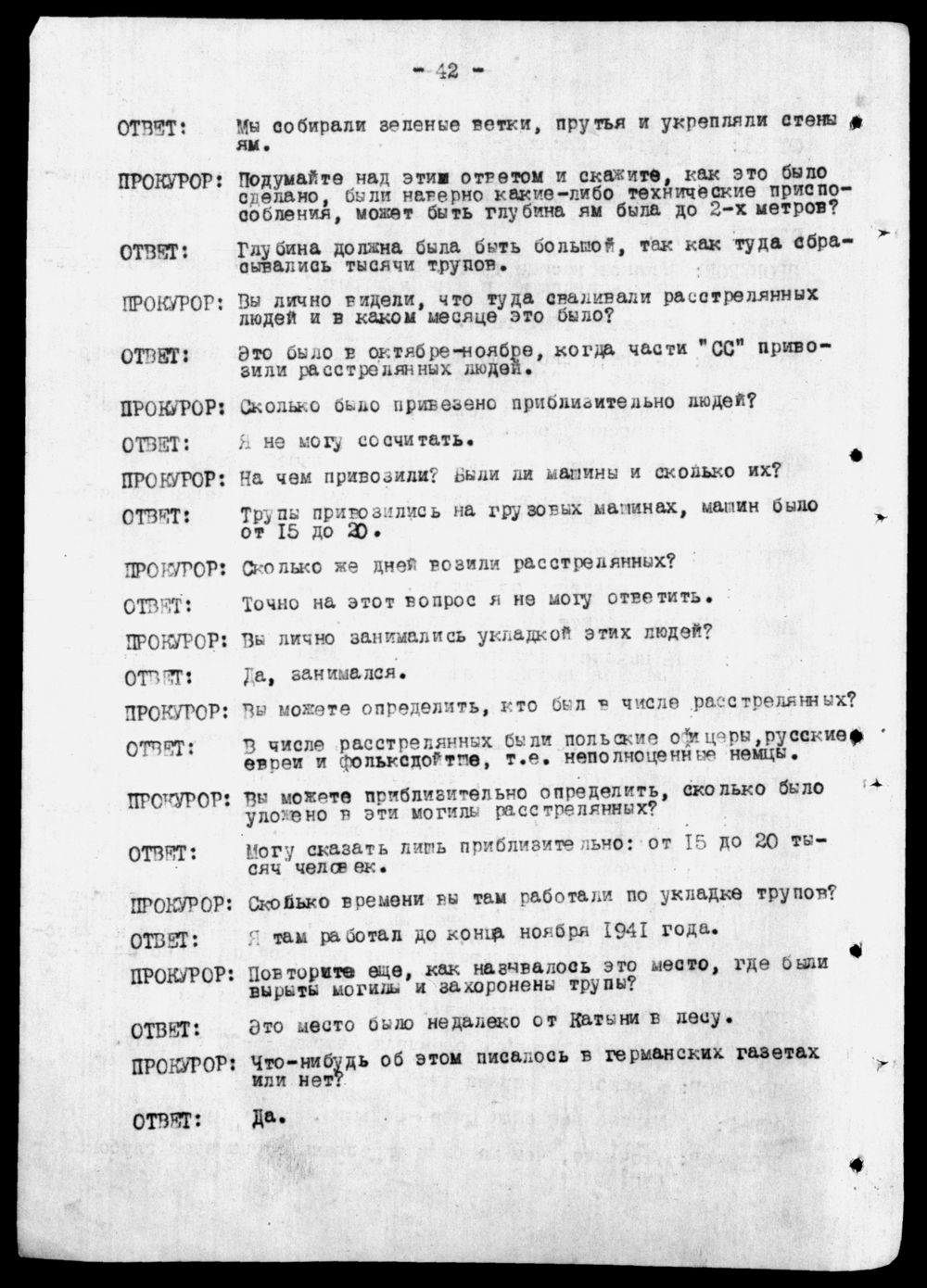 Есть другие показания. Немецкого солдата Глемвица, участника расстрелов в Катыне. Или немца Дюре, который на суде в 46г. рассказывал, как они по ночам рыли ямы в катынском лесу в октябре-ноябре 41г., куда свозили трупы поляков, русских, евреев.