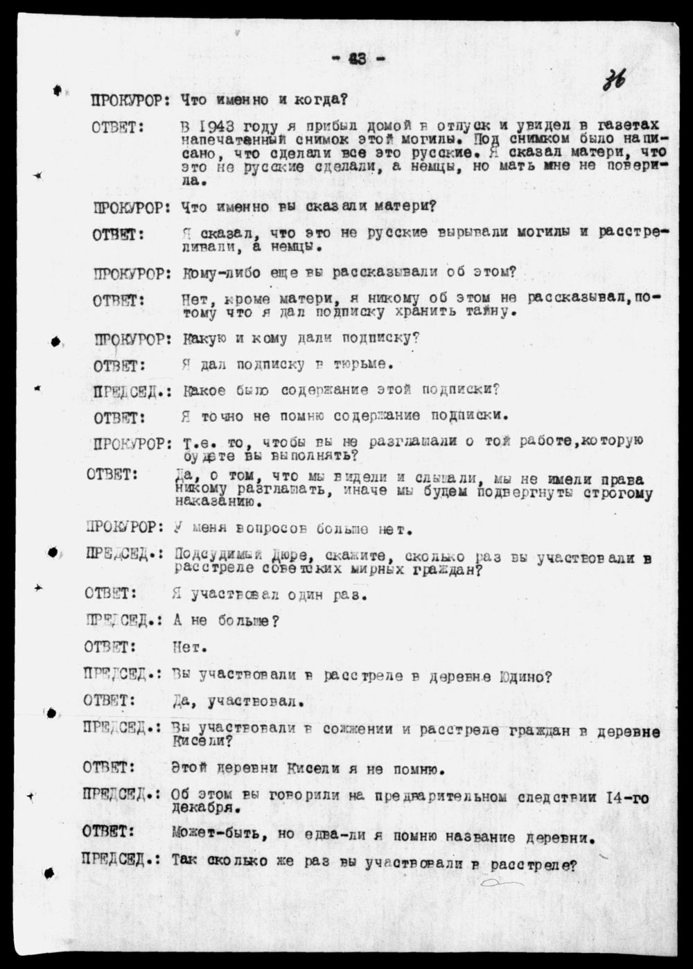 Таким образом, Дюре просто дико противоречит себе уже даже в показаниях, данных на предварительном следствии, которые противоречат показаниям, данным во время судебного заседания. И самое главное: нигде в материалах предварительного следствия не упоминается катынский эпизод. Тем не менее, во время судебного заседания происходит следующий диалог: