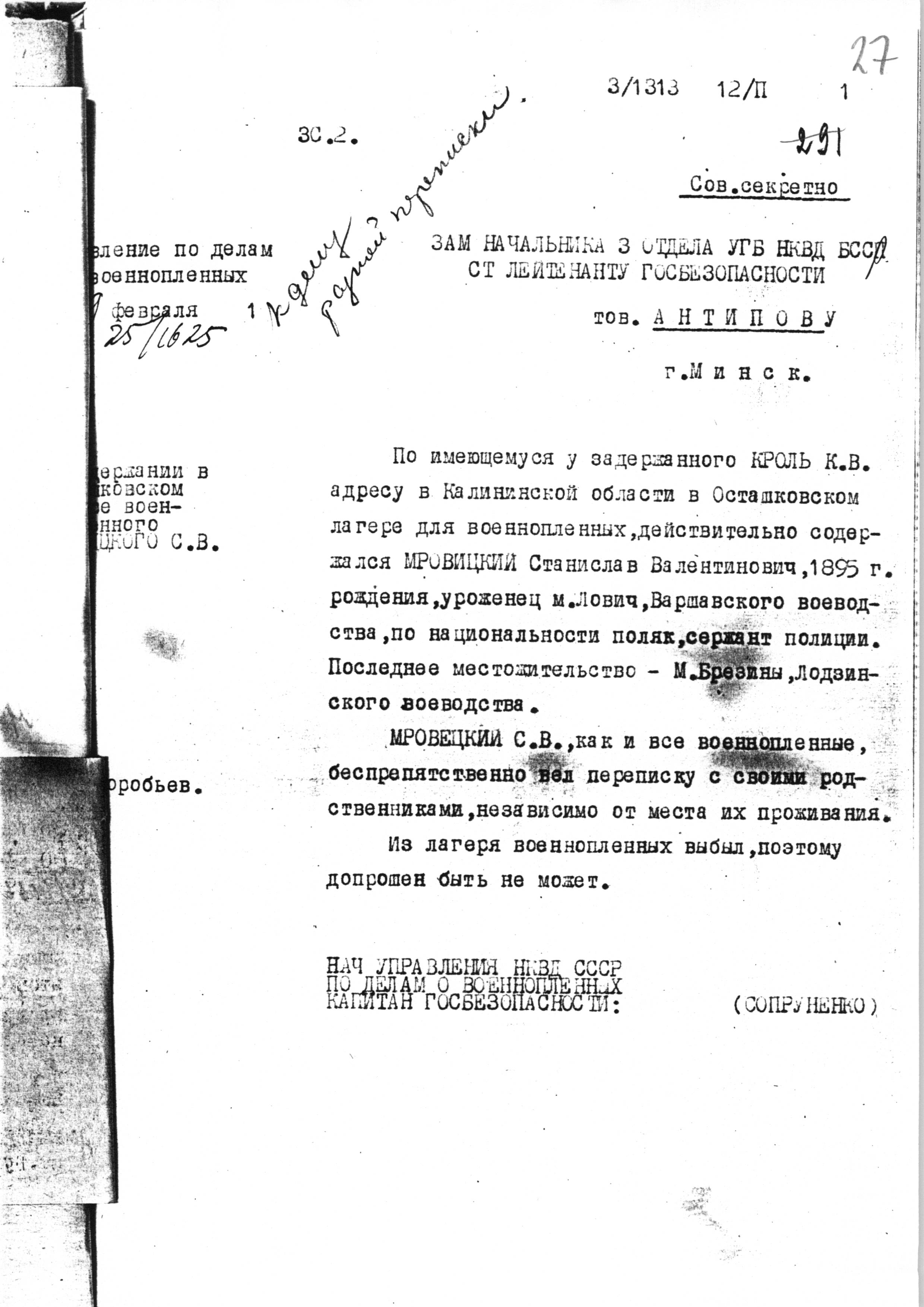 Предлагается разрешить переписку польским военнопленным и интернированным в существующих и активных на данный момент лагерях - Грязовецком, Козельском, Суздальском, Ровенском, Юхновском и Севжелдорлаге.