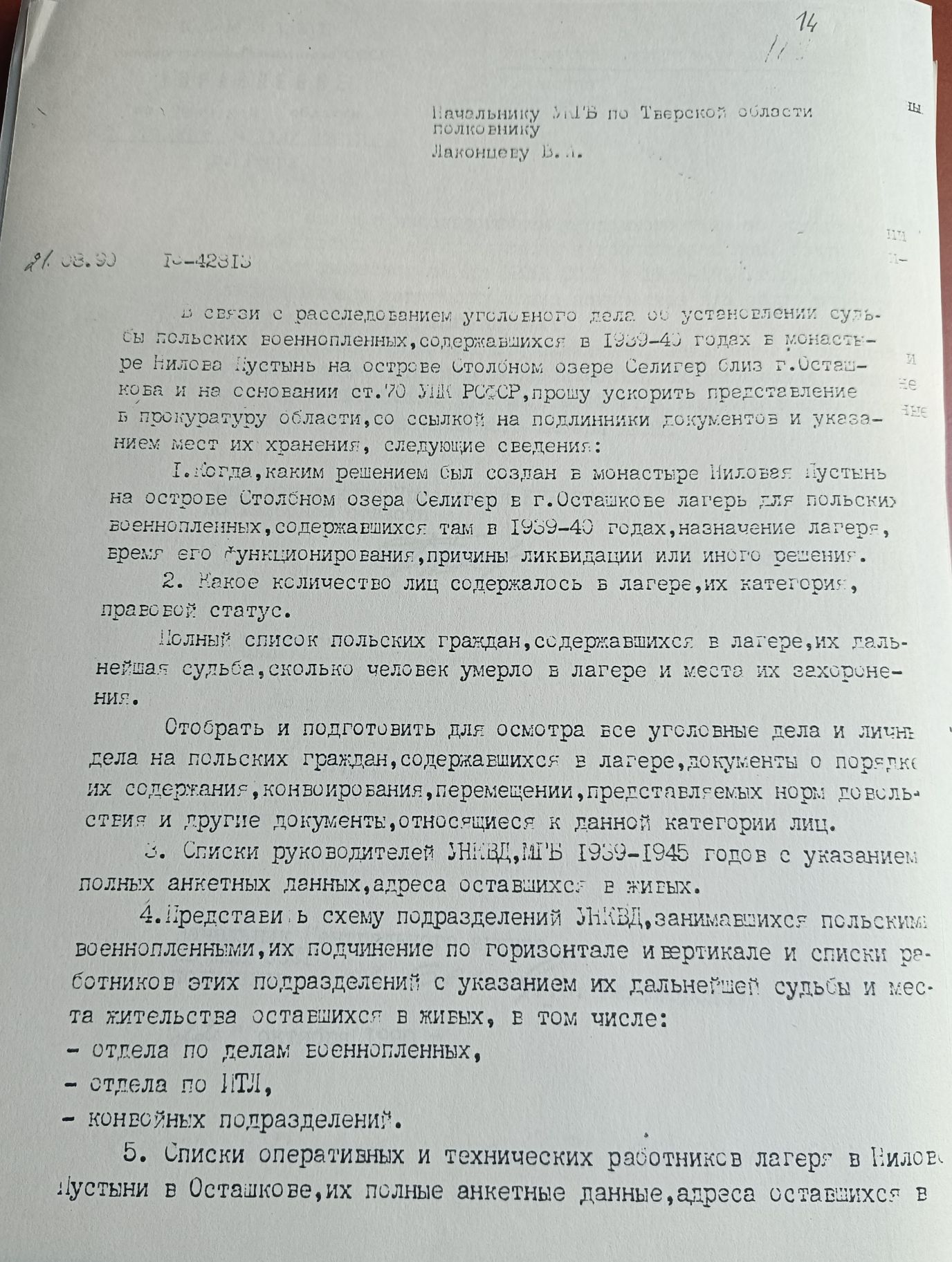 Давайте вглядимся еще раз в процитированную выше справку Сопруненко от июня 1941 года. Сопруненко сообщает о 1082 побегах за все время с 1939 года – на 130 тысяч военнопленных. Если применить это в процентном отношении к 15 тысячам военнопленных, можно было бы ожидать от них примерно 125 побегов. Но неизвестен ни один убежавший с "дорожных работ" поляк из списков погибших! Это лишь одна из проблем, которые возникают при попытке представить себе, что поляки были живы после мая 1940 года. Действительно, во-первых, мы имеем полное отсутствие документов о них. Для сравнения: в РГВА хранятся тысячи документов о поляках из трех лагерей до весны 1940 года, разного рода сводки, отчеты, переписка – в общем те завалы документов, которые и должны были отложиться на протяжении многих месяцев плена, документы, отражающие все стороны жизни. Нет даже самой малости - хоть каких-нибудь документов о том, что военнопленные были куда-то направлены после того, как они были переданы под расписку соответствующим УНКВД. Привезли 6 тысяч осташковских поляков в Калинин, а дальше-то что? Что в живых их после войны не было - очевидно. Нашелся бы хоть кто-то из шести тысяч, и, учитывая тщательнейшие поиски поляков, об этом было бы известно. Что же с ними случилось? Где они были? Почему за весь предыдущий период документы в наличии, а после мая 1940 года – как отрезало?